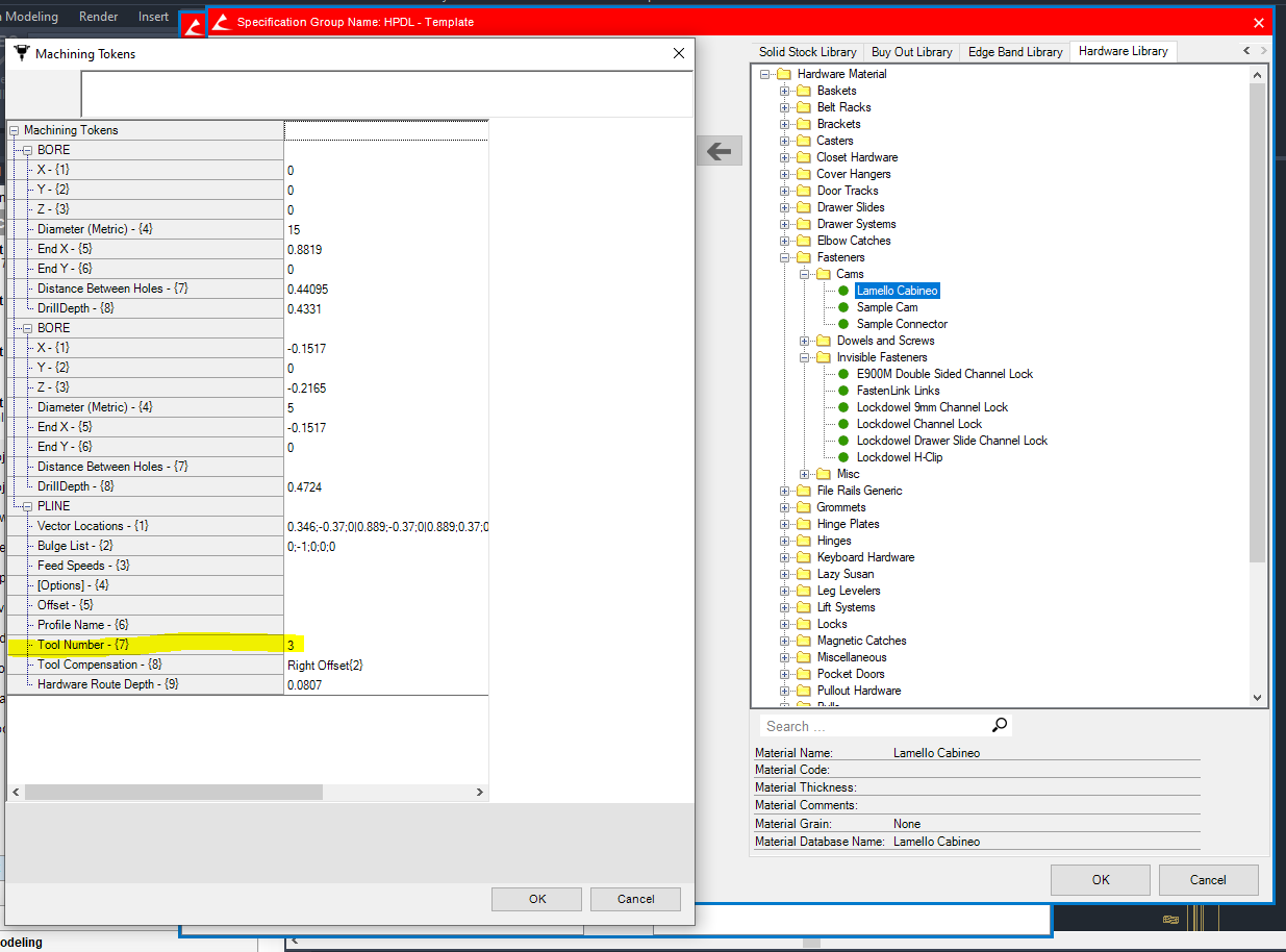 I figured out how to use the Cabineos and successfully have the edgearray machine token and all that. But when it goes to machine these, it is picking up our 5mm and trying to bore the 15mm hole with that bit. I cannot seem to find a place to change it to rout and setting a different bit like our 1/4" or 3/8" compression. We do not have a 15mm drill bit but can get one. But where would I even set that tool number? As you can see, it is using the 3/8" bit for the pline which is for the