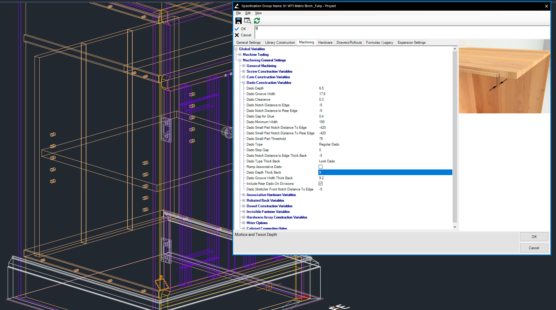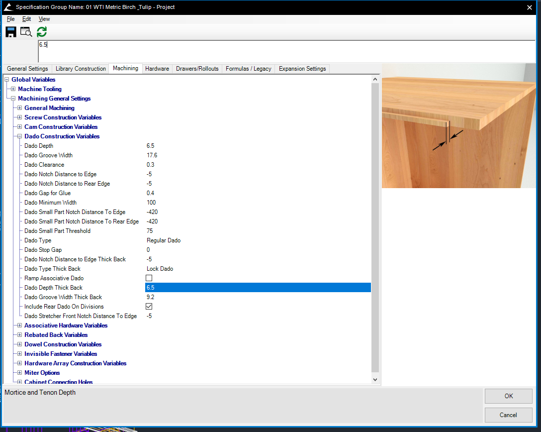 Can anyone tell me why the thick back rebate option appears to be hard locked to a tenon depth of 6.5mm. I want 9mm half the thickness of a 18mm board. This will help me in other areas, but every time i adjust the paramters to do with back boards and rebates etc, they get demolished and just turn a thick back with no rebate and machining. 2 screenshots, one is a 6,5mm tenon one is set to 9mm.
