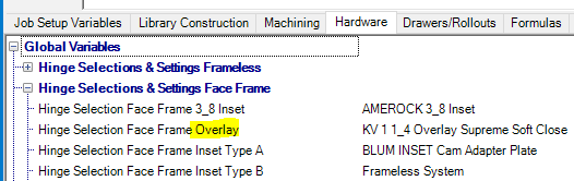 I am trying to setup 2Door Pie Cut Corner Face Frame Cabinets to be able to switch out the Hinges/Plates being used for these cabinets. By default, all the Face Frame cabinets use whatever hardware is selected in the Global. I need to be able to change out the hinges or even switch to frameless hinges (to get a hinge and plate) to get the proper opening angle.