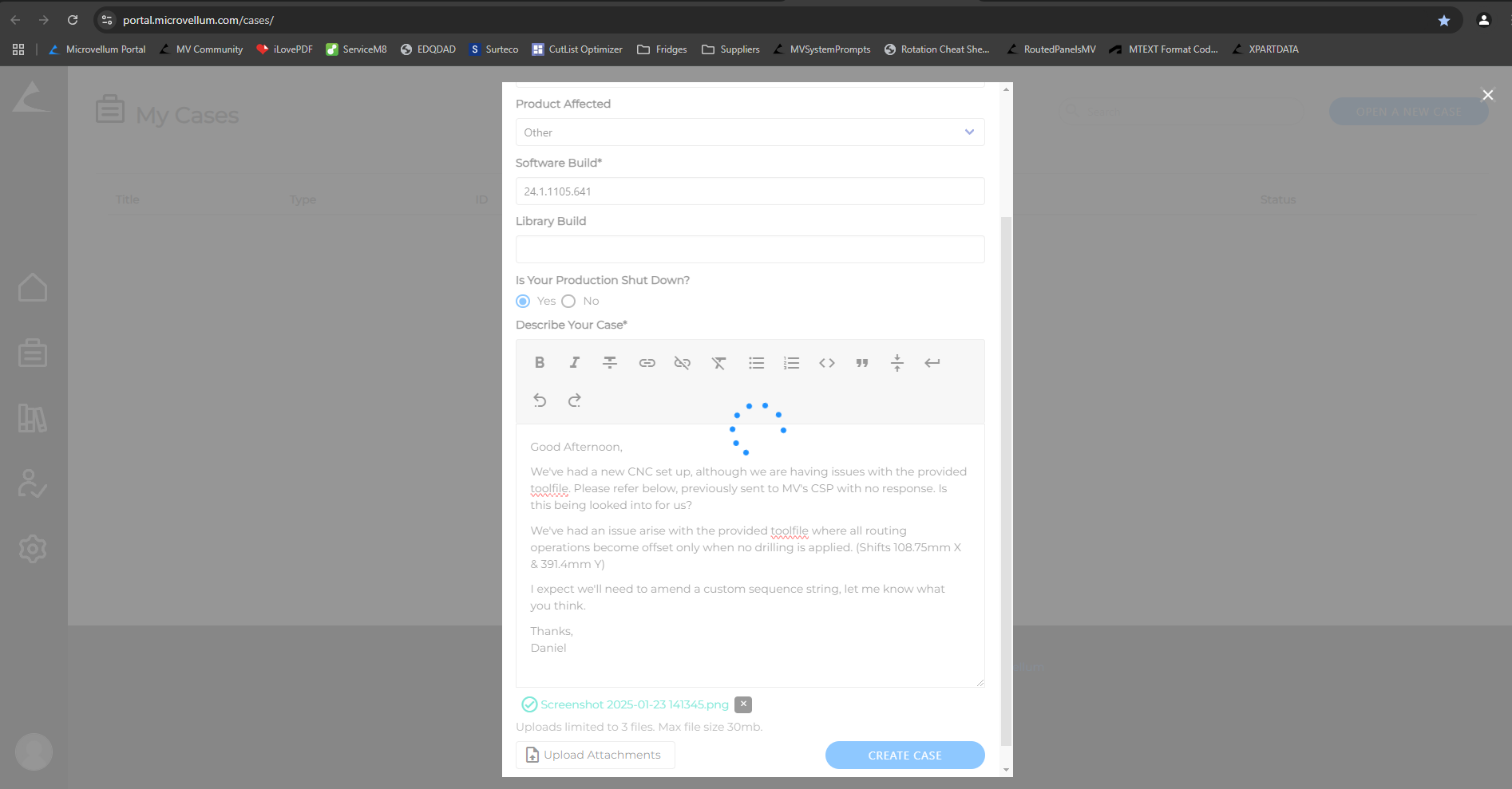 I can't create a new support case from within Microvellum and I can't create a new support case from the portal either. (infinite spinning circles)