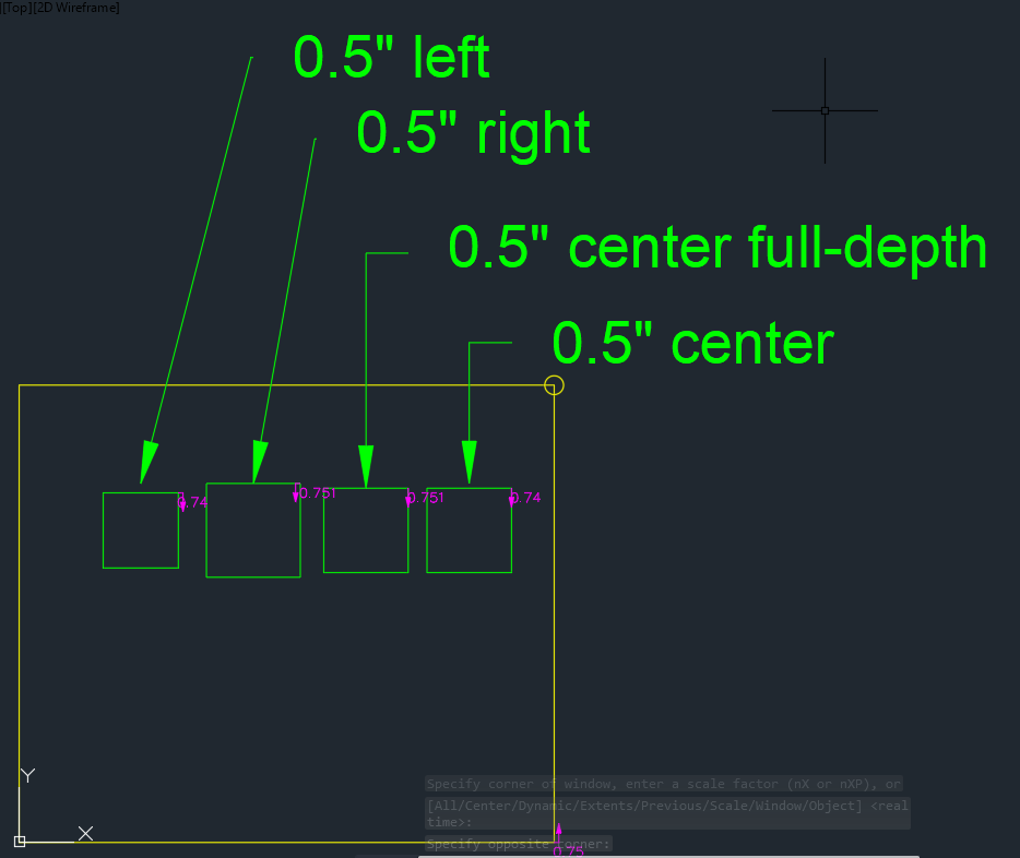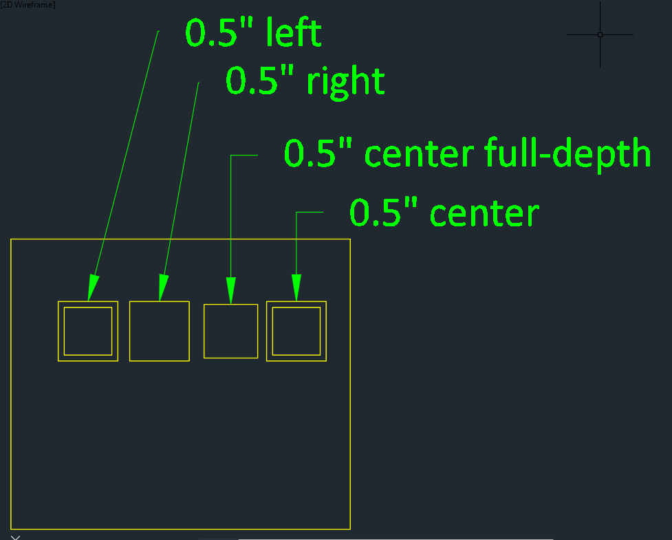I created some identical routes set to left/right/center compensation and using offsets that should allow the output to be the same. You can see from the screenshot, the center line full-depth cut is not displaying correctly on the 3D part. These are all using the same 0.5" diameter tool.