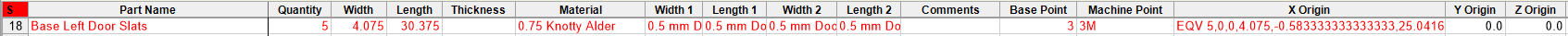 I am trying to build a custom door style with multiple vertical slats spaced evenly. I found the EQV function is *almost exactly what I need. I have one row in my CutParts with the slats and I'm using the EQV formula to space them evenly.