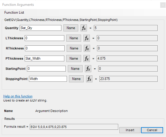 =GETEQV(Slat_Qty,0,0,Slat_Width,-((Width-(Slat_Width*Slat_Qty))/(Slat_Qty+1)),Width+(((Width-(Slat_Width*Slat_Qty))/(Slat_Qty+1))*2))