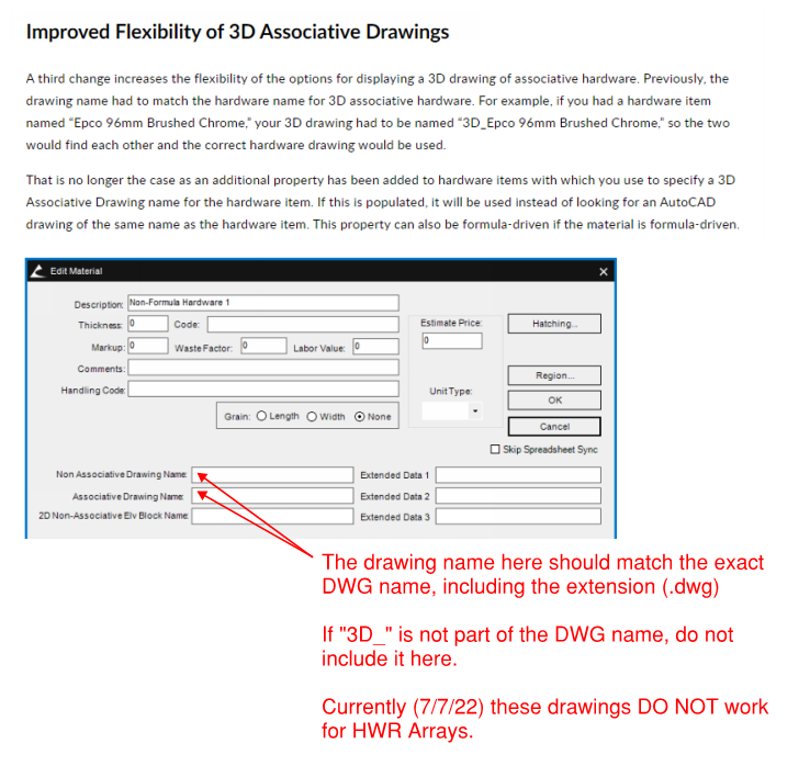 Most of the hardware I have implemented is through hardware arrays, so this option would really be beneficial for us. It would allow us to use 1 drawing for several different hardware allocations. The drawing library we maintain would be able to decrease significantly. Since the arrays are called "Associative HWR Arrays", I had hopes that these "Associative" drawings would work, but it was confirmed in an MV ticket that they are not programmed to.