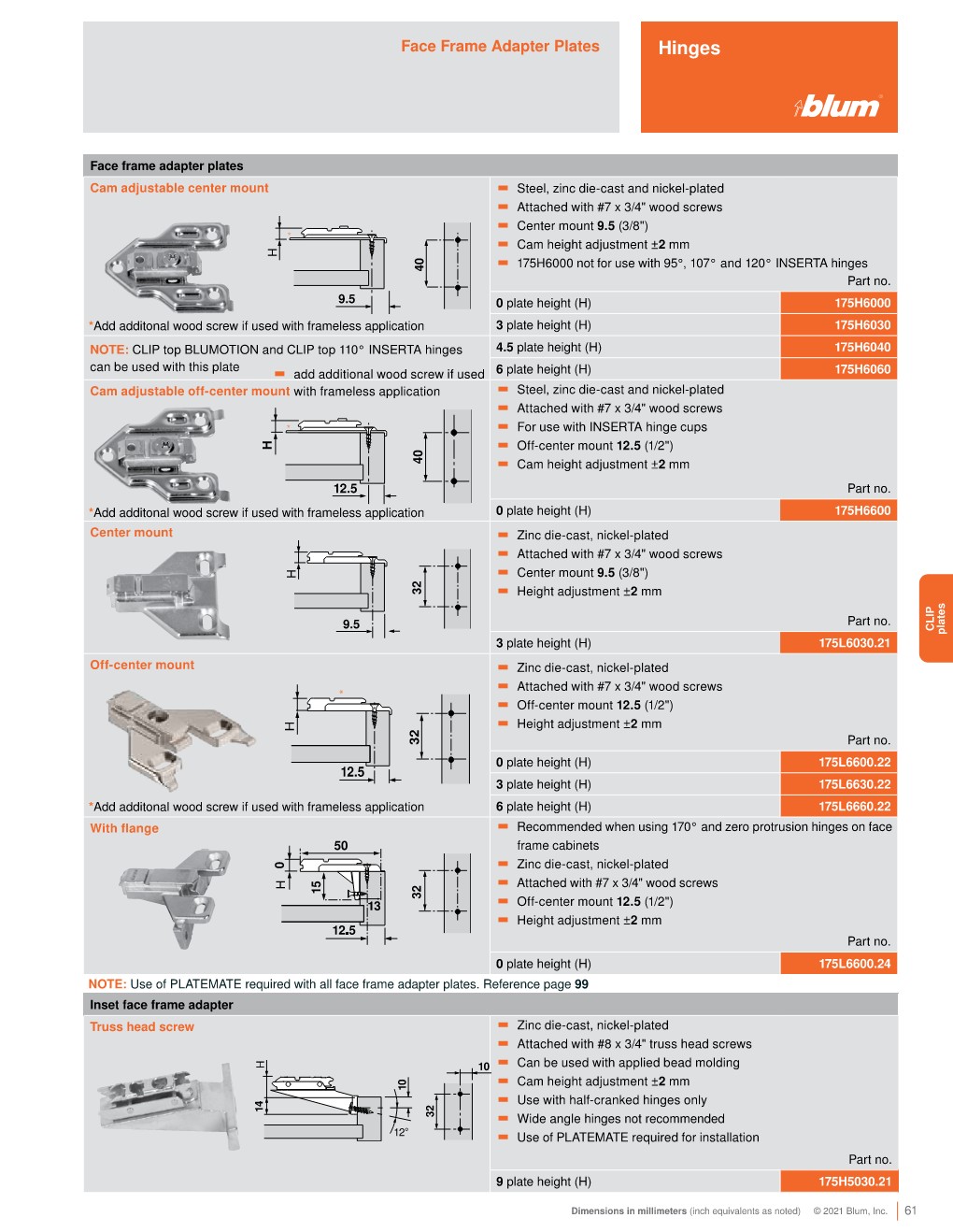 It would be great to have the Blum and Salice face frame hinge plates added to the FF library.