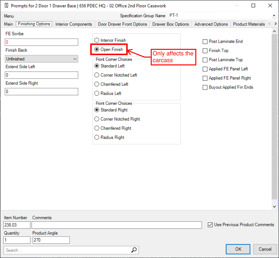 When prompting a cabinet and toggling the "Open Finish" toggle under "Finishing Options", only the carcass is changed to open finish, while all of the interior components remain white mel. I don't understand the reasoning behind this. Why would you want just the carcass and not the shelves or drawer boxes changed to open finish? This would make it extremely easy to finish the entire interior of cabinets, without having to adjust the Project Spec Groups.