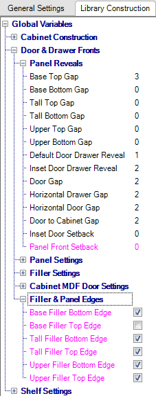 - Global Variables --> Library Construction Tab --> Doors & Drawer Fronts --> Filler & Panel Edges -->