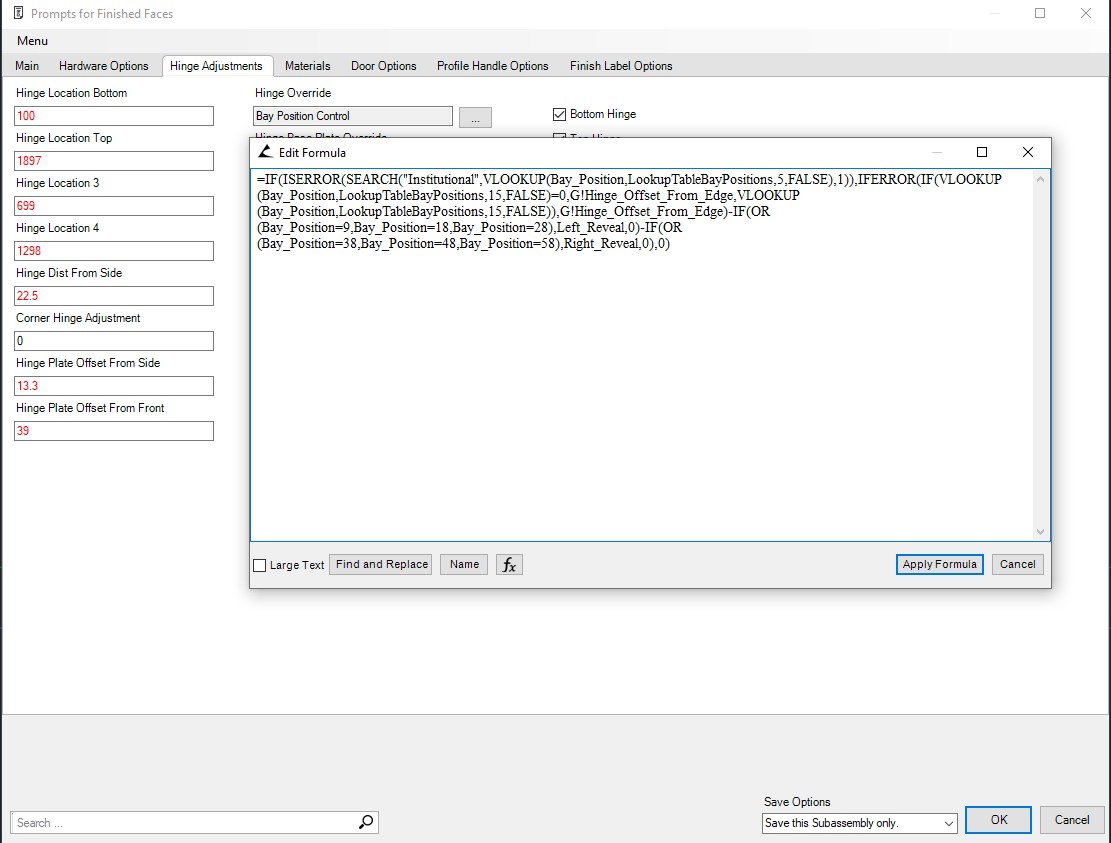 So I have the newest Toolbox and library and now whenever I set a reveal to the edge of the door the hinge hole moves with it to always be at 22.5mm to center of hole from edge of door. This is not the way it is supposed to work since the 22.5mm should be from edge of cabinet. In my previous version of microvellum the hinge hole would move to allow for the 3mm reveal. Not sure if someone else has done something to correct this. There seems to be some type of reference to the reveal but I can't get it to work.