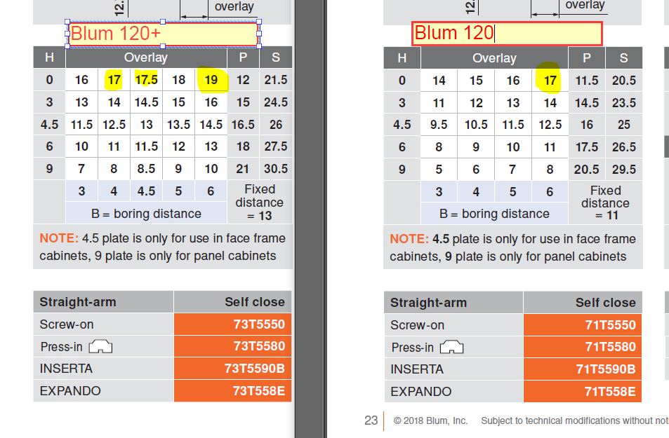 Looking at the look-up tables I understand how and why it is drawing and machining the hinges with their offsets the way they are in the drawing I have. But the hinge specs show that its not the case.