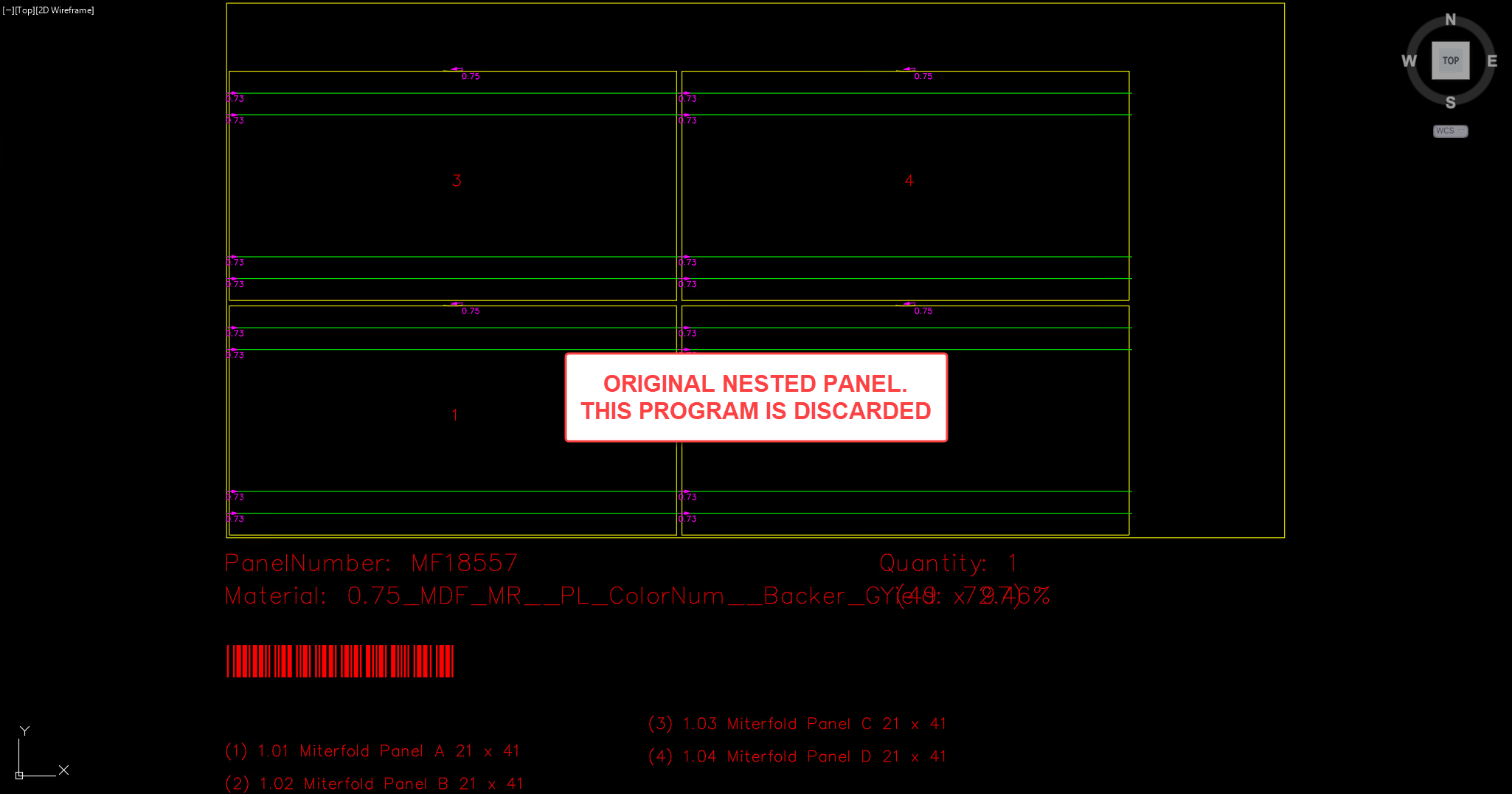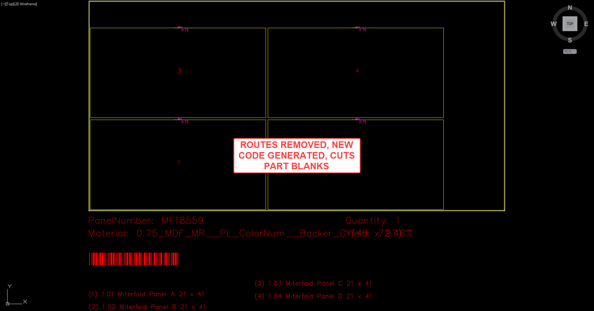 This process then introduces a mess of steps and operations for engineering. First, we have to nest the panels and remove miterfold machining so the parts can be cut. Then we have to "score" the table again, so the operator knows where to place the individual panels - at this step the parts must have a much larger gap between so the v-cutter doesn't hit other parts. Then we have to add the miterfold machining - without borders - so we don't machine away the edgebanding. Well... removing borders from the nest and creating g-code does not create nest reports, so these sheets end up being printed using MVPN (MV Plot Nests).