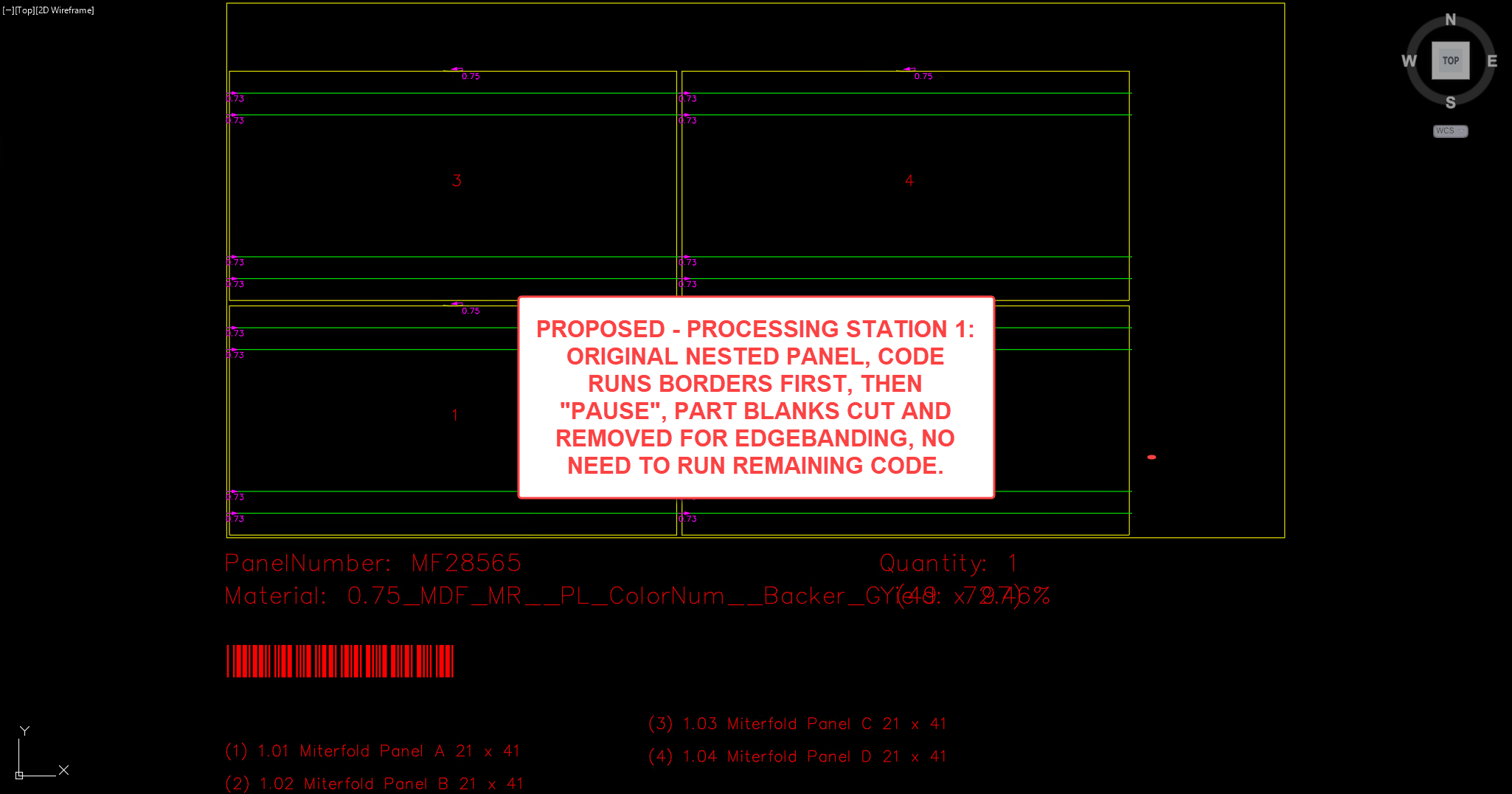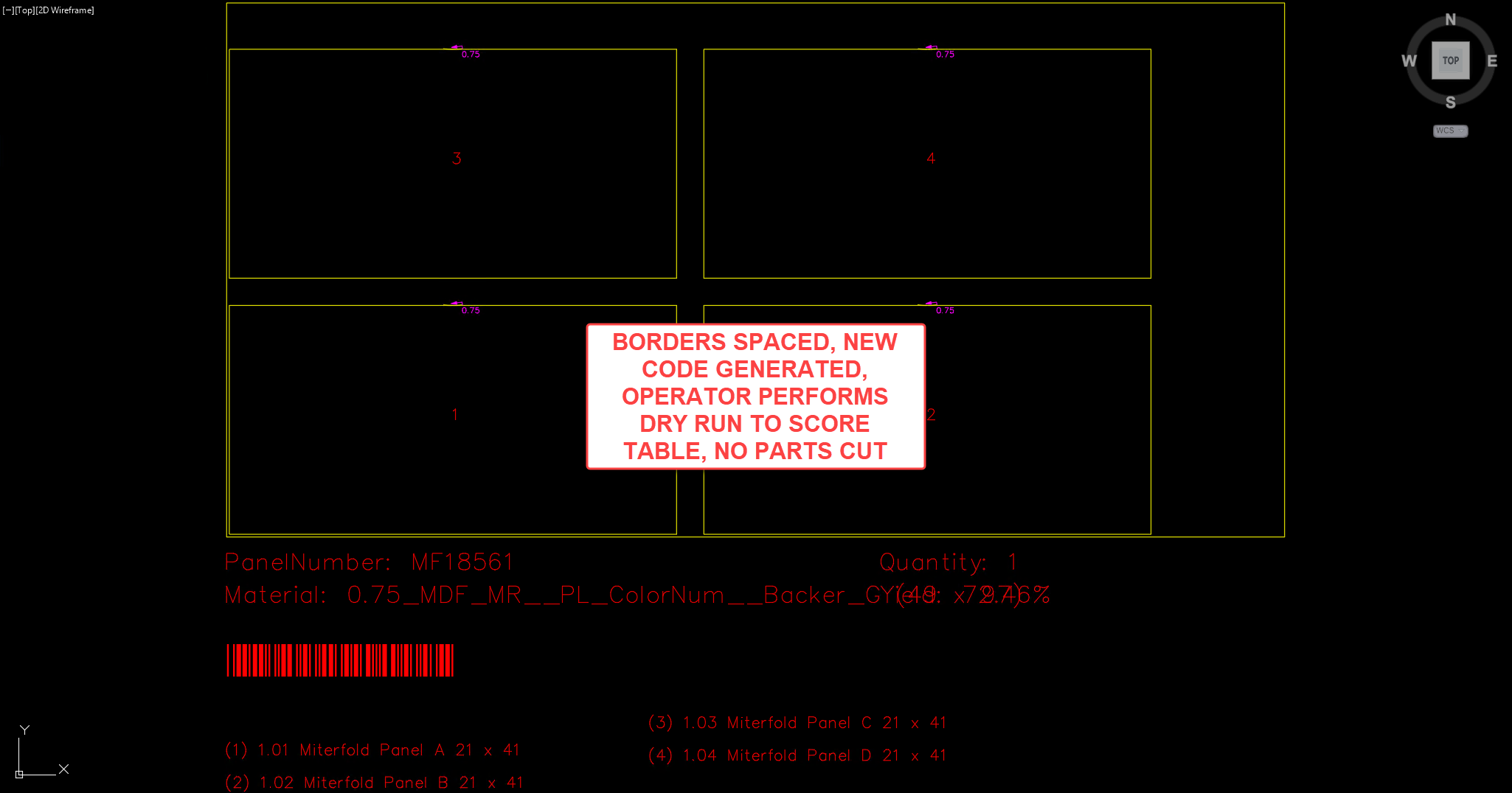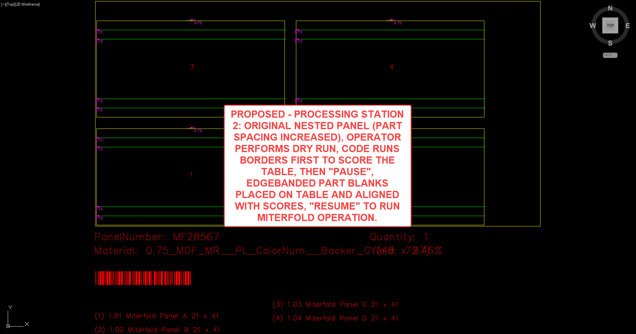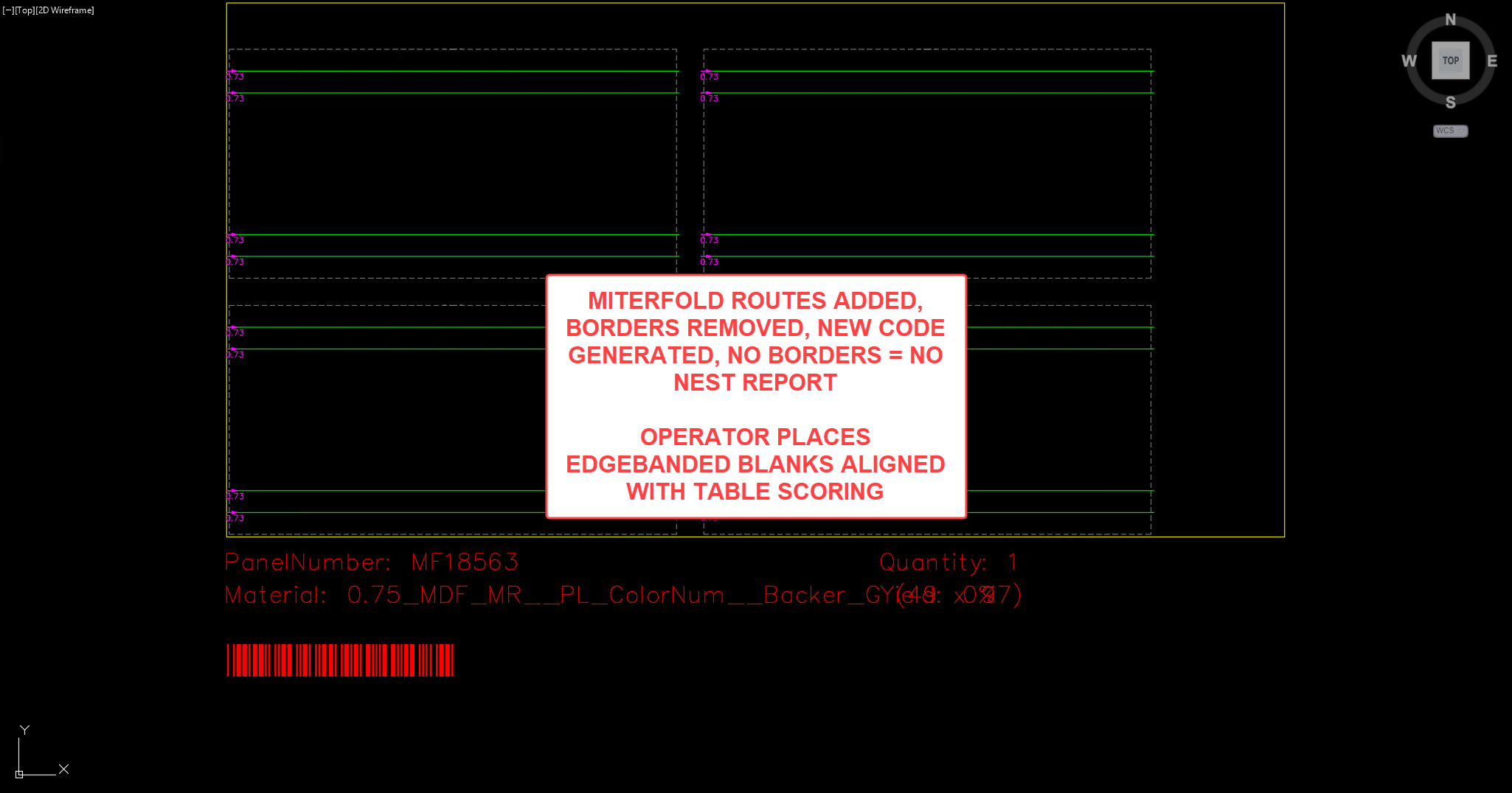 With new engineers and operators, this process becomes nearly impossible to train effectively. HOWEVER, with the ability to do what was mentioned above - borders first, then miterfolding - it allows our engineers to simply nest those parts using two Processing Stations and not have to do anything else. First Processing station cuts the blanks with standard part spacing - with the borders cutting first they can cancel at the "pause". For the second Processing Station - with a wider distance between parts - they can do a dry run of the border sequence to score the table; then at the pause, they can place the panels where necessary and then resume the rest of the sequence.