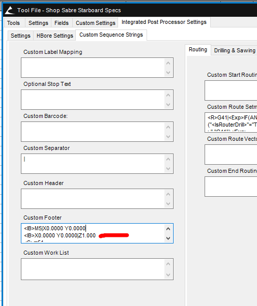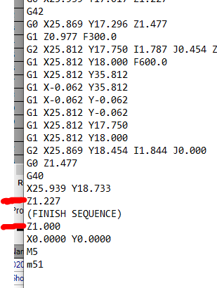 As the title says... We would like our router to go to the back of our CNC when the sheet is done. It comes to our home position which is in the way and we have to jog it back manually. We also just ran a 1.0625" laminated solid wood sheet and it just ruined it because the code is at 1" hard valued. See below. I want to change the height and XY position.