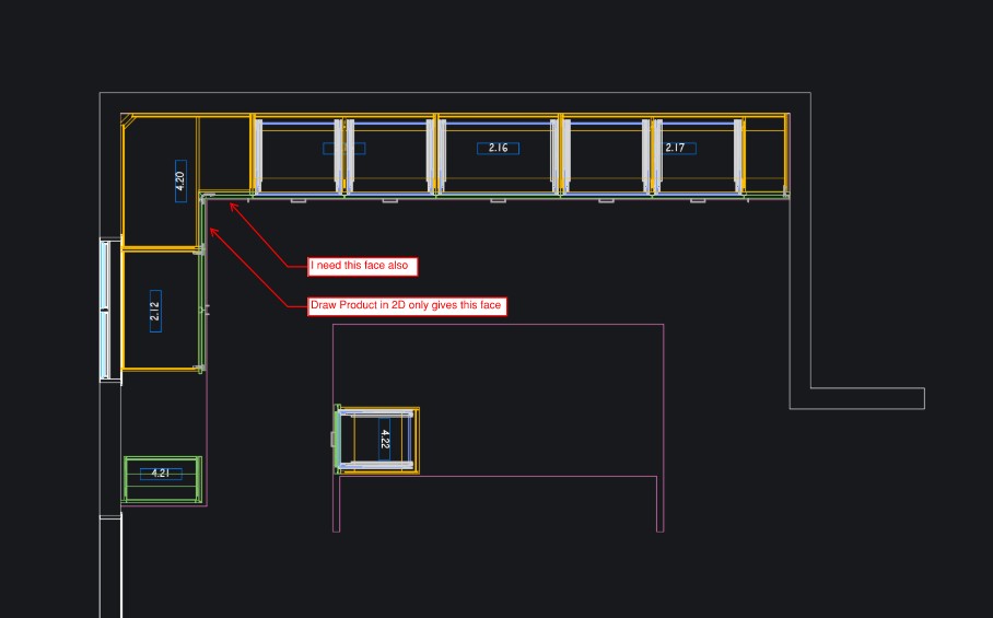 I have a corner cabinet inserted into a room and rotated 90°. When I draw the cabinet in 2D for the elevation, I am only able to get the one face. How do I draw the opposite face for the adjoining wall?