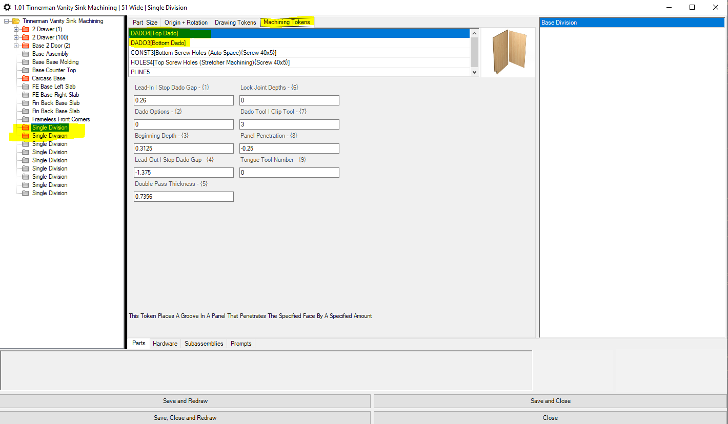 I am having an issue with a partition/divider for a vanity. The single division is supposed to be dado into carcass bottom and top stretchers with a 1.5" set back and that is not happening. I created this vanity using a starter product and saved it to our library previously and that machined fine on our CNC. Now that we ran this again it is not associating the set back and dado. I drew a new product starter and that is working as normal so I compared the machining tokens in part properties and they are identical so I am not sure what happened or what I did wrong. See pictures of the issue and what it is supposed to be like. Red is the issue and green is how it is supposed to look.