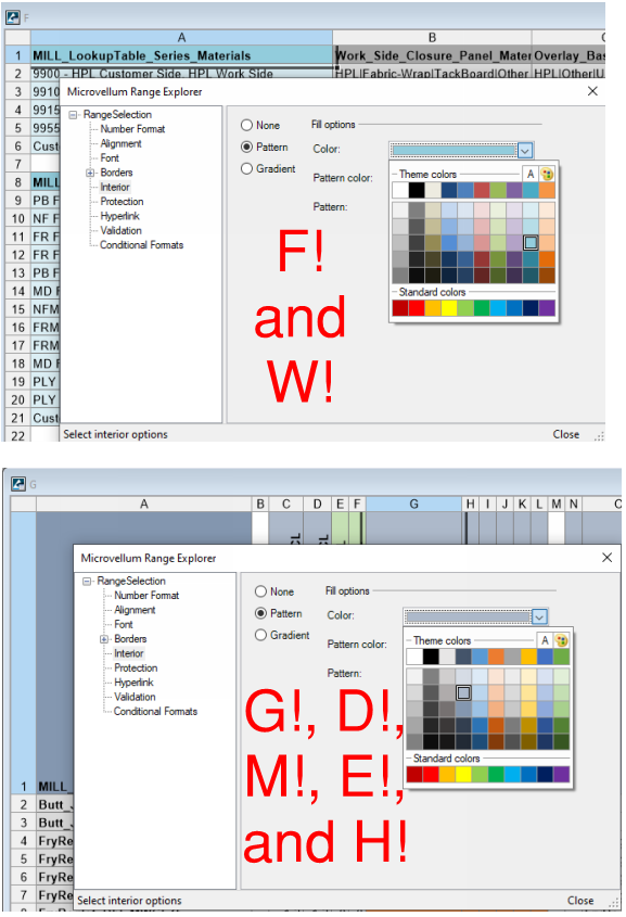 The color options for cell formatting are different between workbooks. The F! and W! workbooks are the same, and all others use a 2nd selection of colors. We like to try to color code our lookuptables, and this would be easier if we had the same color availability in all tables.