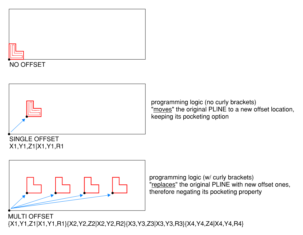 If you offset a PLINE only once (without curly brackets around it), the option for making it a pocket will hold. However, if you offset it multiple times (which requires curly brackets around each instance), the PLINE loses the pocket option you tried to apply. Though I understand how it is currently programmed (explained by MV support, illustrated by me below), as a user, I expect the PLINE to keep its properties, no matter how many times I offset it. There is no logical reason I would