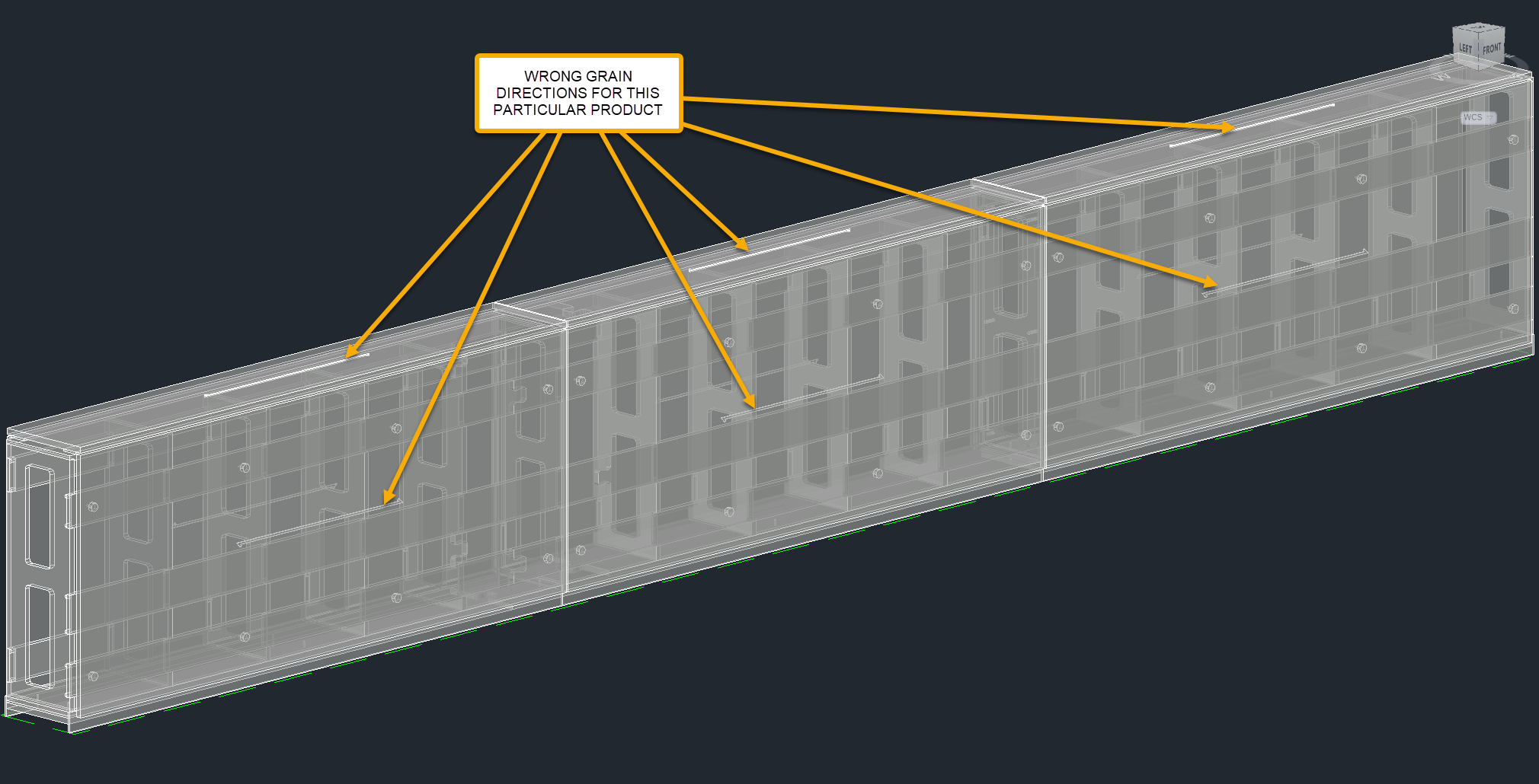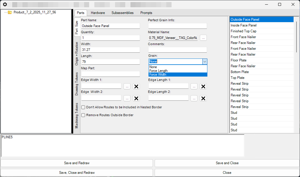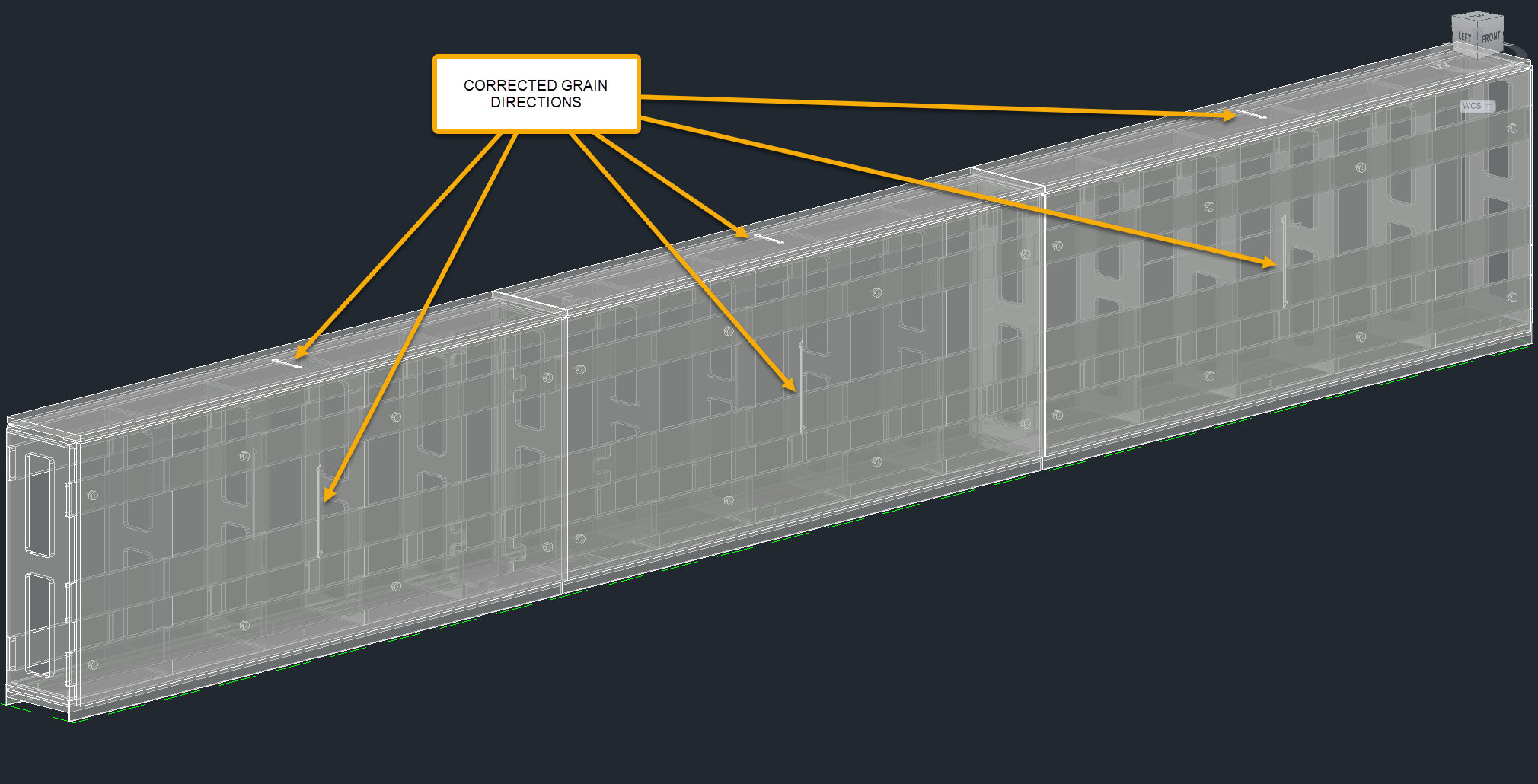 To greatly reduce this, and help catch grain issues at the engineering stage, we've developed a parametric grain direction arrow that routes in any panel it's added to (draws only, won't nest). We have this in our Token Clipboard and paste it into any part that has a grained material assigned. Upon redraw, it instantly becomes apparent which parts are wrong. From there, we open Part Properties and "Force Width" for any incorrect parts, and "Force Length" on correct parts. (The reason we do "Force Length" even if it's correct is due to nesting issues we've discovered when using cross-grain material. Leaving those parts defaulted to "None" results in those parts rotating in cross-grained materials.)