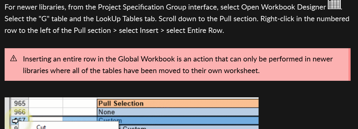 rying to find the lookup table for pulls. We are trying to add 10 new pulls. Article dosen't seem to match my library. I'm in a component library - 47.1. The article says there should be a lookup tab in the G workbook. I see no tabs at all.