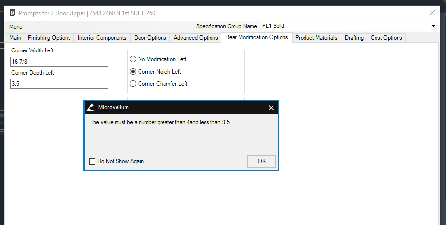 Trying to make a corner notch at 3 1/2" but getting this error message that it must be greater than 4". Does anyone know where I can change this to be able to get a smaller notch?