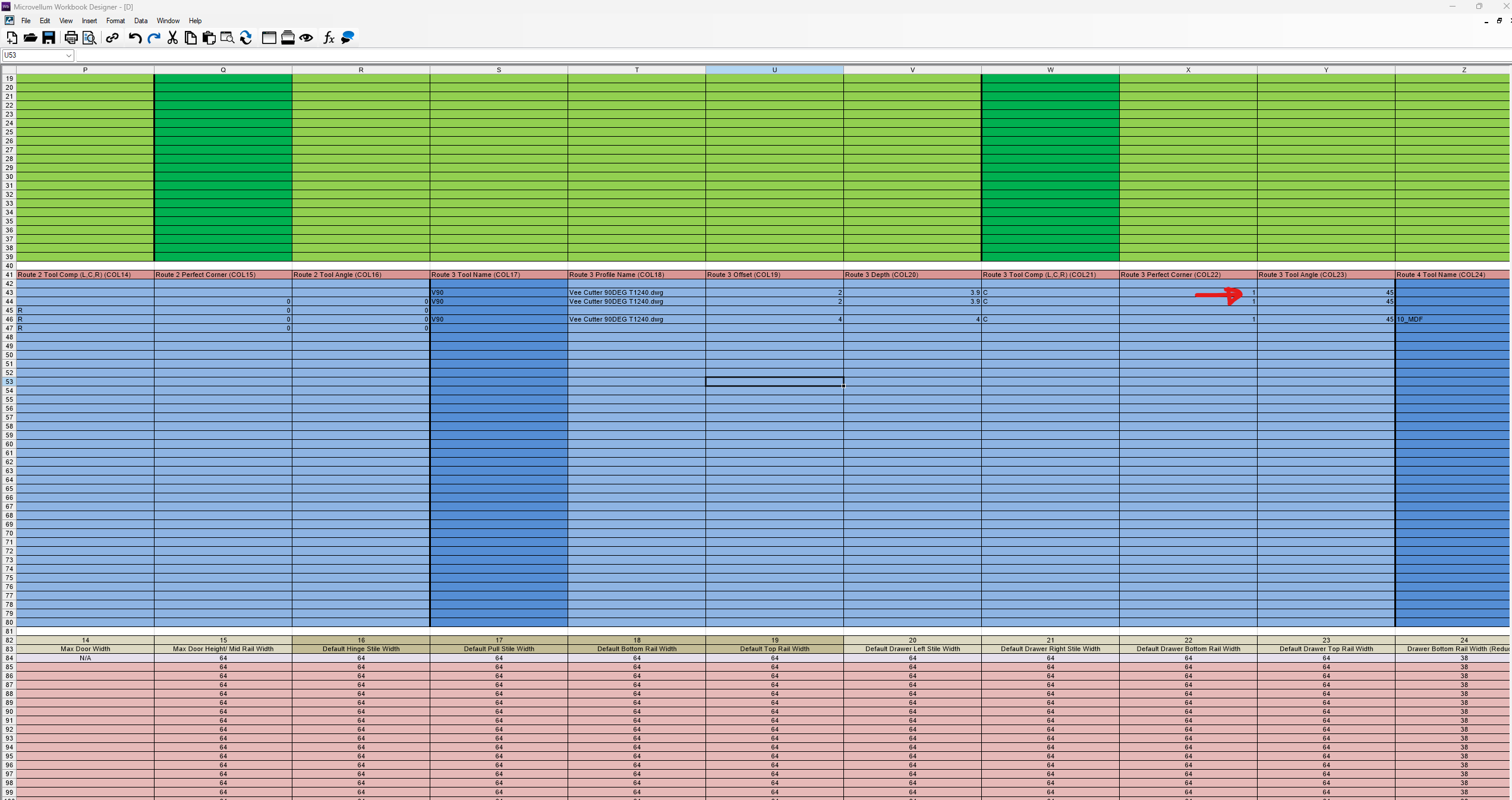 In the workbook, Route 3 Perfect Corner (COL22) is set to 1 (TRUE) for this panel.