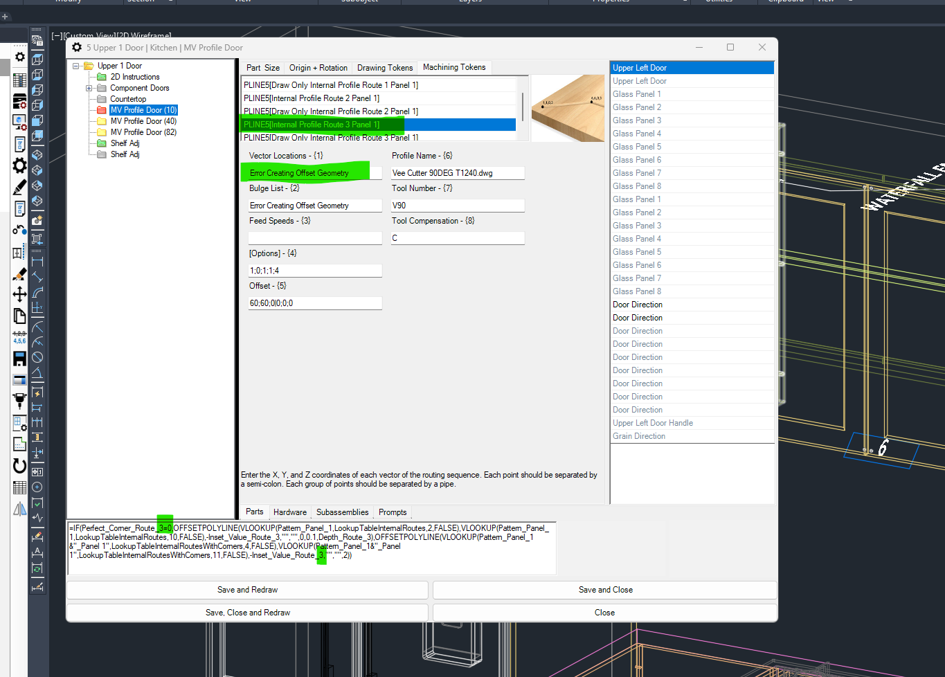 I'm having an issue with Route 3 - Internal Profile not generating correctly. I'm getting the error "Error Creating Offset Geometry" when trying to use the formula in the machining token. The highlighted green area in the formula is linked to the Perfect Corner Route 3 logic and seems to be causing the problem.