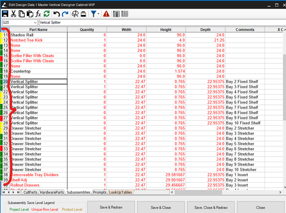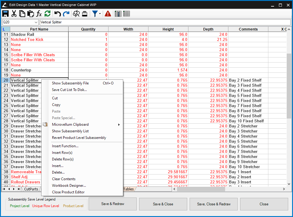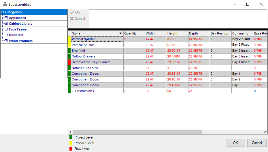 Subassemblies - Project/Product/Row Level Colors on Workbook Designer