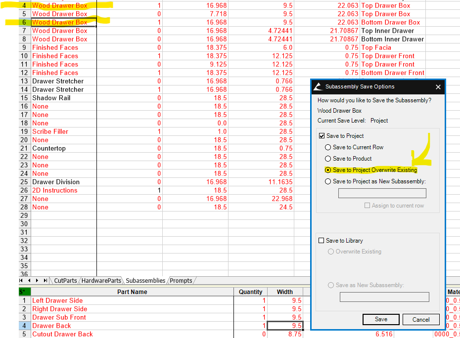 Doesn't overwrite the other "Wood Drawer Box" subassemblies in the same project.