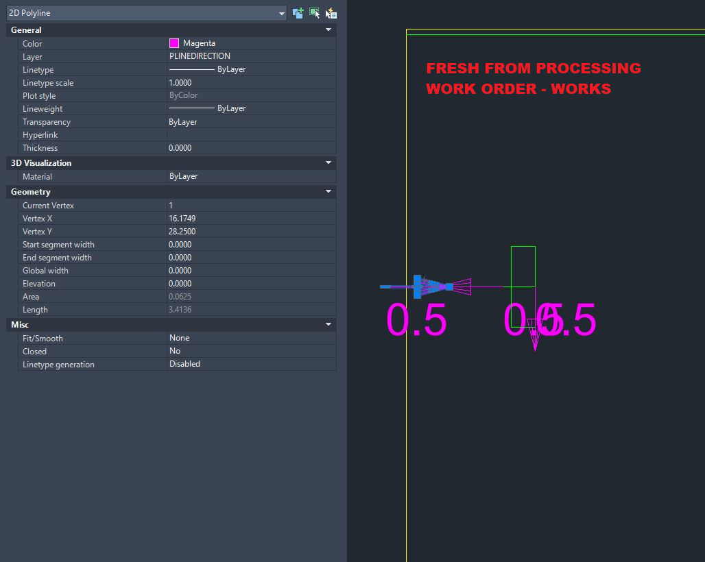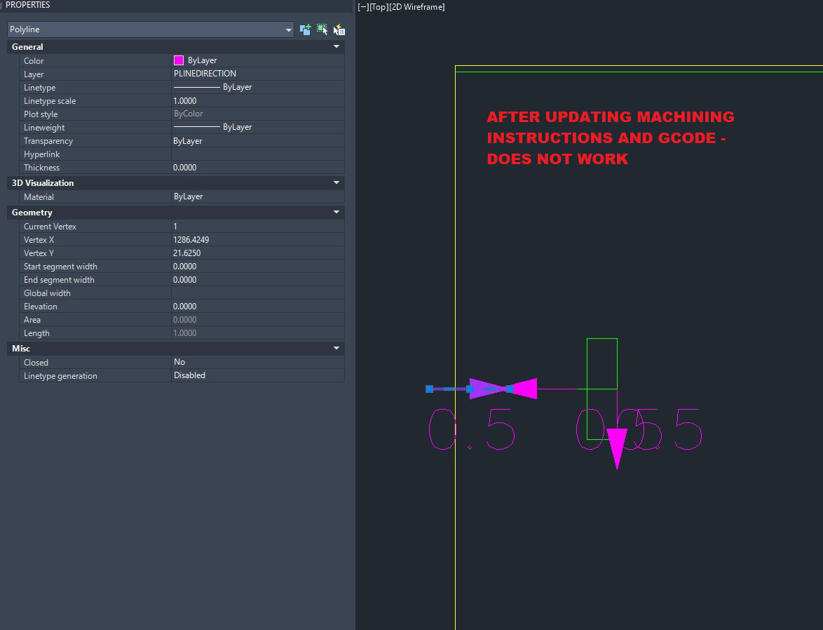However, if we find we need to modify the machining after processing a work order (say the countertop needs to shrink by an inch or something), we use the 2D Machining tools to "create new" or "update existing" machining instructions and gcode from drawing... we get a result that looks different and our CNC fails to run. The PLINEDIRECTION arrows change from 2D Polylines to regular Polylines; and the machining for the dog-bone shaped cut outs fails to run at our CNC.