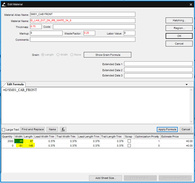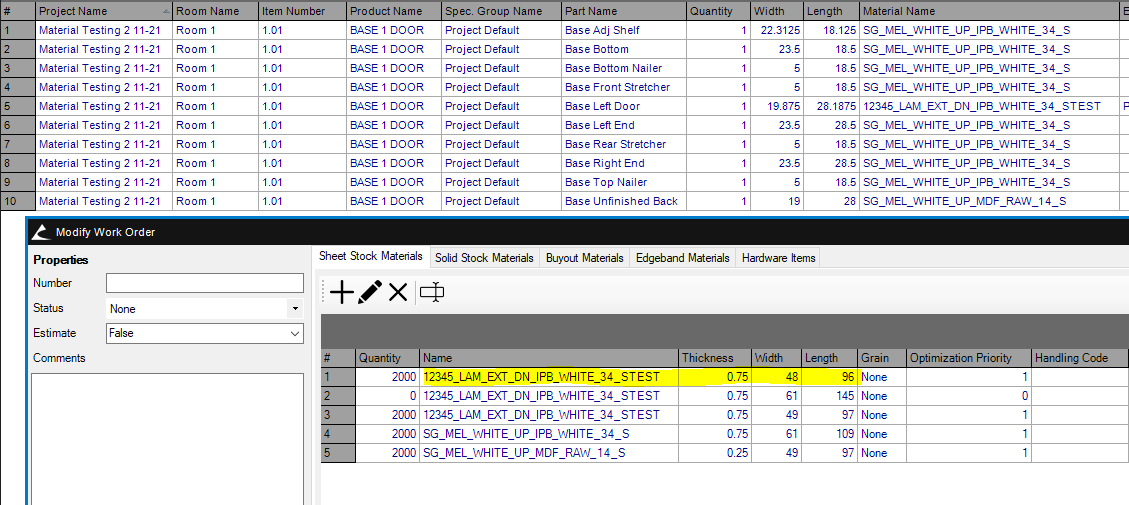 This is a formula generated material and I've checked the lookup table and formulas used for these and they should be correct. And even if it was an issue with the table or formulas, there's only two sheet sizes linked to it, so I'm not sure why three get added to the work order. I changed the formula generated material name to make sure there wasn't a different separate material somehow causing this, but all 3 sheet size material names changed when I did that, so that doesn't seem to be it either.