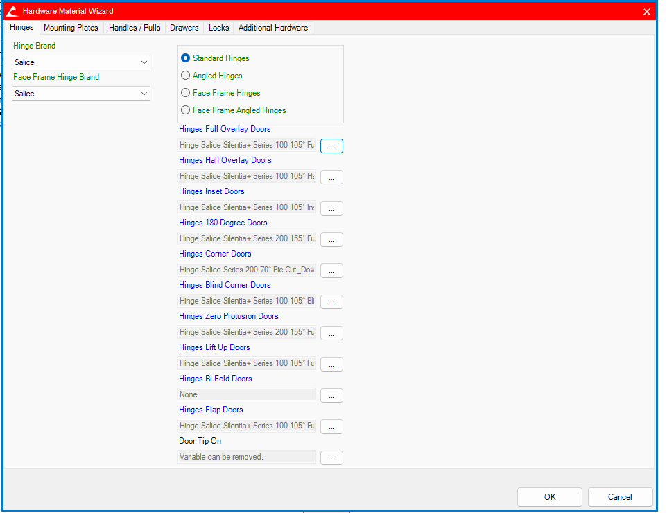 In this case the difference is between a 45 and a 48 dowel hinge option. There are many more for sure but I had to open the spreadsheet to verify materials. I'd be content with clicking the ... and having it highlight the current material.