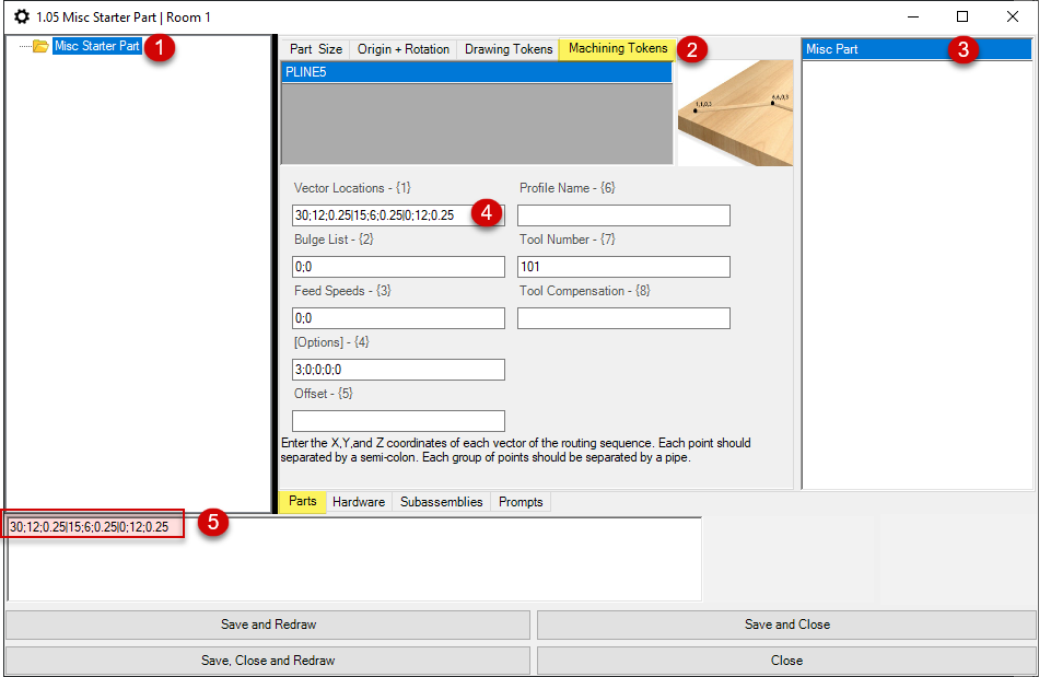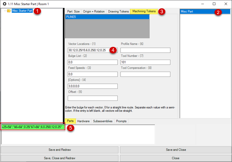 Currently, the program determines if the entity has been modified. If a specific machining operation has been adjusted in some way, we update the values resulting from the formula with hard locked values. One of the conditions that the program interprets as modifying the machining operation is when the vector point values returned from AutoCAD don’t match the values from the token. When that occurs, we assume that the entity has been modified and we overwrite the formula with hard locked values. The typical indication of this condition is a token point list formula that results in values with more than five decimal places. The rule of thumb is that the more decimal places there are, the higher the chance of having mismatching coordinate values and thus overwriting the formula with a hard locked value. As you can see in the two examples below, after updating the 2D part, the formula is overwritten with hard locked values in the current version, and the signal for this are the values with up to 14 decimal places.
