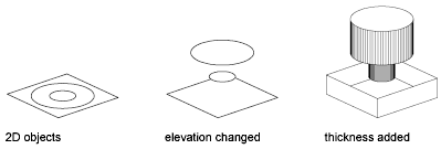The orientation of the UCS when the object was created determines the Z direction. Objects with a non-zero thickness can be shaded and can hide other objects behind them.