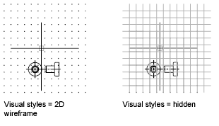You can change the display style of the grid with several options in the Snap and Grid tab of the Drafting Settings dialog box. For example, the grid displays as a rectangular pattern of lines by default, but you can change it to the legacy dotted grid style when the visual style is set to 2D wireframe.