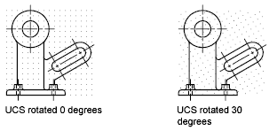 If you need to draw along a specific alignment or angle, you can change the grid and snap angle by rotating the user coordinate system (UCS). This rotation realigns the crosshairs on the screen to match the new angle. In the following example, the UCS is rotated 30 degrees to match the angle of the anchor bracket.