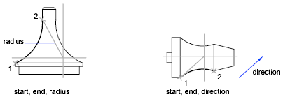 The tangent direction can be specified either by location a point on the desired tangent line, or by entering an angle. You can determine which endpoint controls the tangent by changing the order in which you specify the two endpoints.