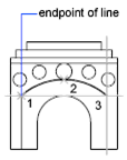 You can create an arc by specifying three points. In the following example, the start point of the arc snaps to the endpoint of a line. The second point of the arc snaps to the middle circle in the illustration.