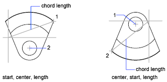 The distance between the start point and the center determines the radius. The other end of the arc is determined by specifying the length of a chord between the start point and the endpoint of the arc.