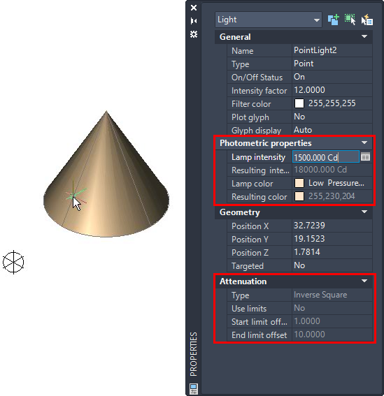 When the LIGHTINGUNITS system variable is set to 1 (American units) or 2 (International SI units) for photometric lighting, additional properties are available for a point light. The following photometric properties can be set via the Properties palette: