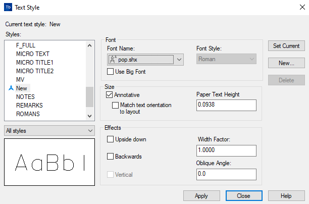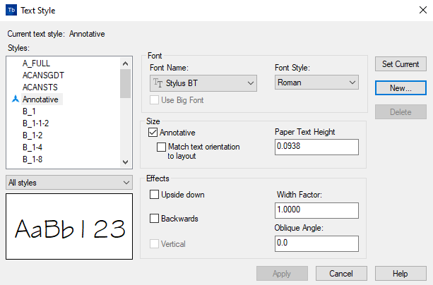 - Select your new text style and click “Apply” once again. All new text being created in model space, paper space, or any other drawings should now use your new font.