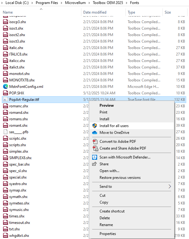 The previous section specifically applies to changing the font of text that will be typed in drawing blocks, such as paper space. The process for changing the font of text in Report Designer is slightly different. It is required to use either .ttf or .otf files for the font, as the Report Designer only recognizes fonts with glyph coding that can be detected by the Windows system, which .shx file fonts do not possess. To install a new font and use it in Report Designer, open the same Fonts folder as above, drag and drop the .ttf or .otf file into the folder, then right-click on the new file and select the “Install for all users” option from the menu. This will require administrative permissions on your device.
