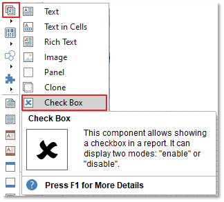 A Check Box is used in Reports for displaying Boolean values. To add a Check Box to the Report Template, select Components > Drag the Check Box component into the template.