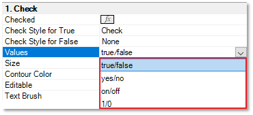 The types of Boolean values can be changed using the Values property of the Check Box Component. The options are true/false, yes/no, on/off, and 1/0.