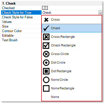 Various styles can be applied to a Check Box. To access the various styles available for the Check Boxes, select the drop down for the Check Style for True property of the Check Box Component. A style for when the Boolean value evaluates as false can also be applied using the Check Style for False property. Figure 02 presents the available styles of check boxes: