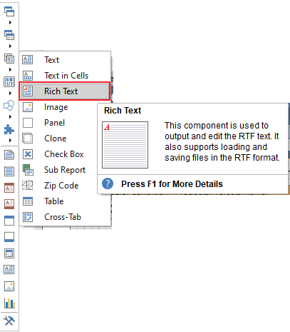 The RichText component can automatically change its size depending on the size of the RTF text within it. It can process expressions and supports a wide variety of styles, processing at the end of report rendering, etc..