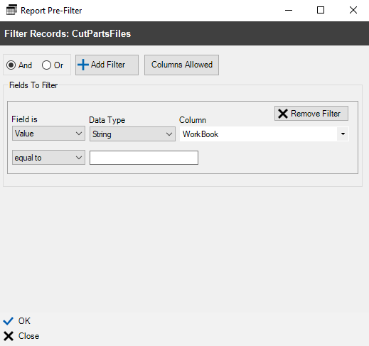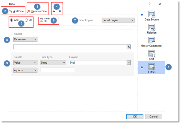 A filter works by establishing a condition to be evaluated as either true or false. Each data row in the Data Source will be processed through the filter individually. If the data row evaluates as true, it will be rendered in the Report. If it evaluates as false, it will be ignored and not be printed.