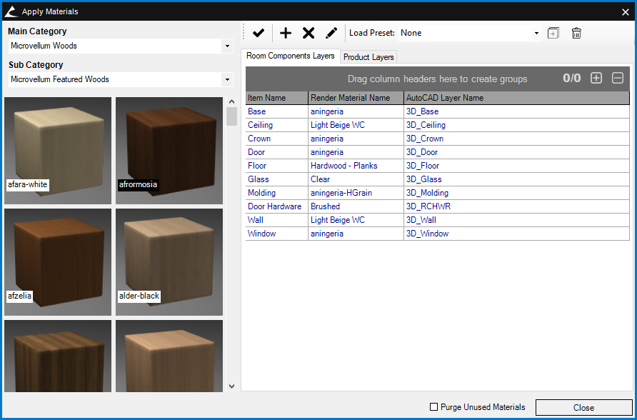 The Apply Materials interface allows you to assign materials by AutoCAD layers.