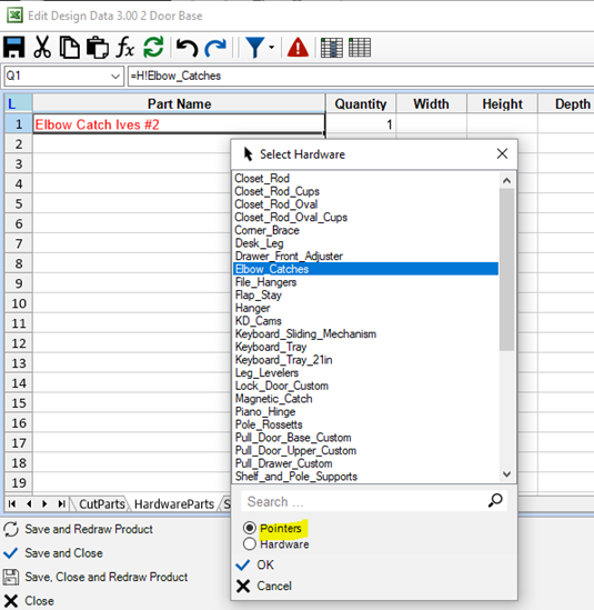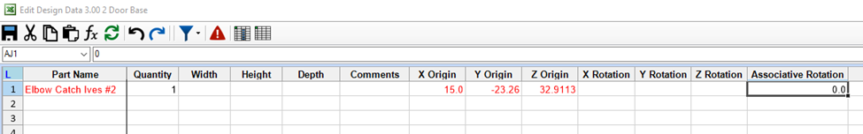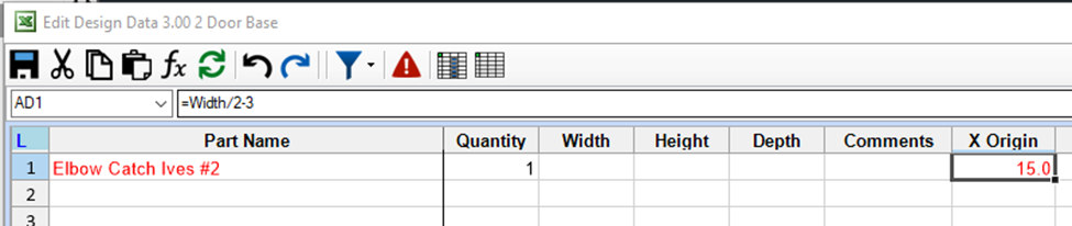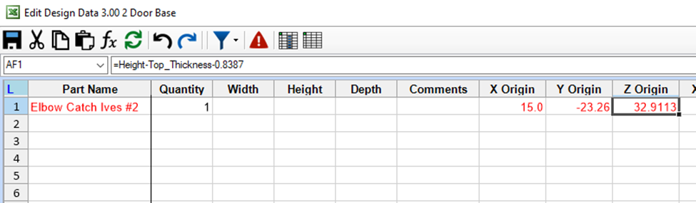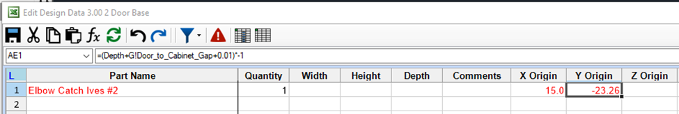 In the Y Origin cell, you need a formula to force the origin point of the elbow catch to penetrate the back side of the door. Since the product’s Y origin is “0”, you need a negative “Y Origin” value for the hardware to penetrate the back side of the door. To do this, use the following formula: