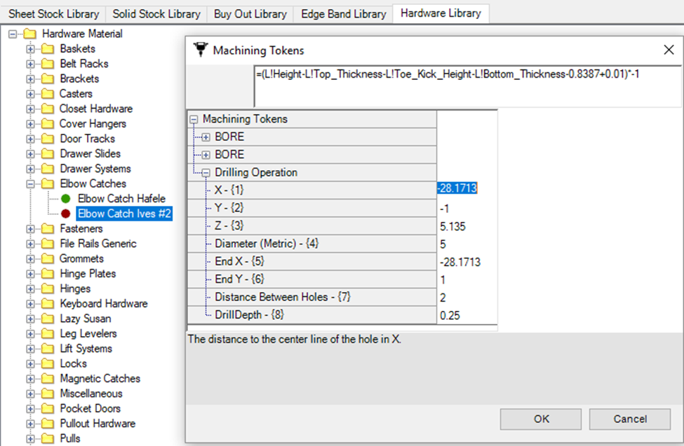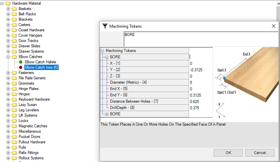 With this information you can easily add other machining tokens to place machining virtually anywhere in the product. For example, to cause the elbow catch to drill a hole in the bottom of the base cabinet, simply add another token. The only difference would be that you would now need a negative value in the “Dim in X” parameter.