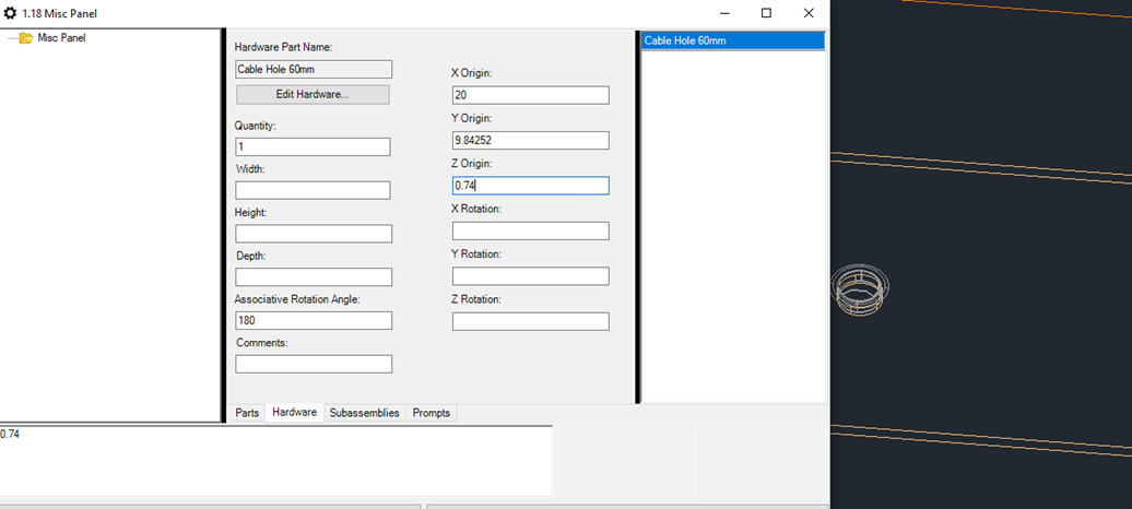 Notice that the Z origin is 0.74. Since the thickness of the panel is 0.75, as a logical conclusion, the Cable Hole must have been placed 0.01 inches into the panel.