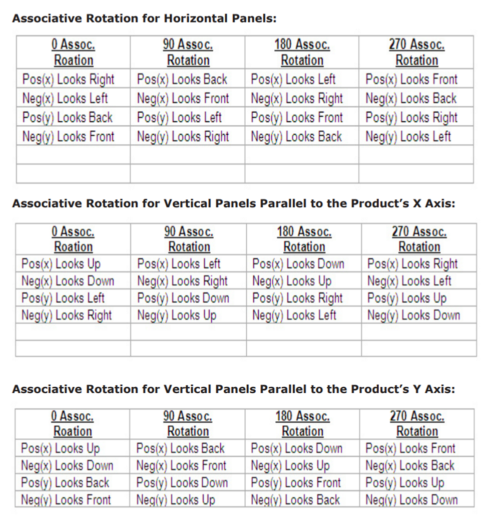 This same hardware can be used for Tall Cabinets and even Upper Cabinets where you need the strike to be at the bottom of the cabinet. You would simply place this elbow catch in an upper cabinet with an associative rotation of 180 so that it would place a hole in the bottom of the cabinet. The following tables show the relationships between the associative rotation and panel rotation to determine the direction to “Look”. It is important to understand that “Left” and “Right” are referring to the product’s X axis, “Front” and “Back” refer to the product’s Y axis, and “Up” and “Down” refer to the product’s Z axis. Pos(x) means that the “Dim in X” and “[End Dim in X]” need to be a positive value. Neg(x) means that the “Dim in X” and “[End Dim in X]” need to be a negative value. The same applies to the Y values.